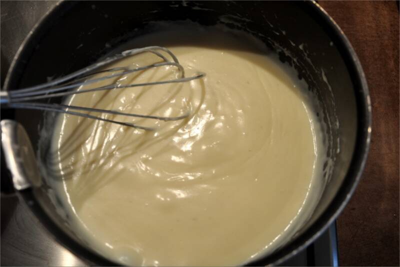 Lorsque le mélange est lisse, retirez du feu et versez doucement le lait en continuant à fouetter régulièrement.